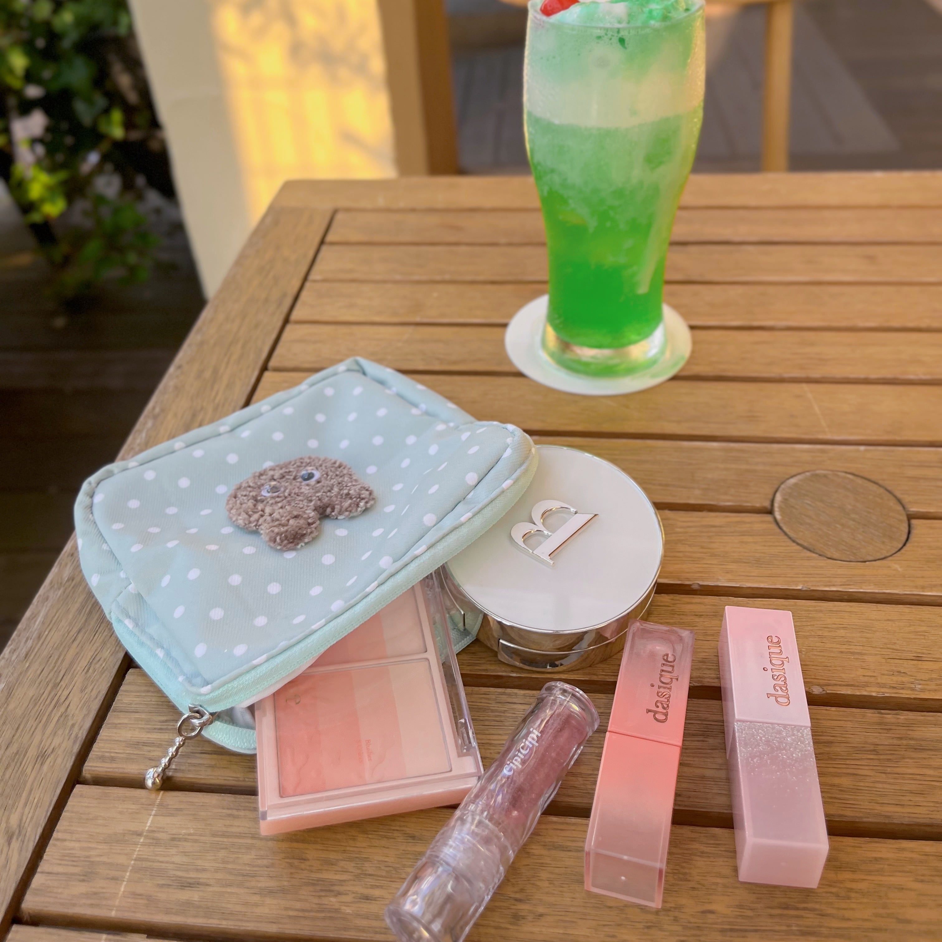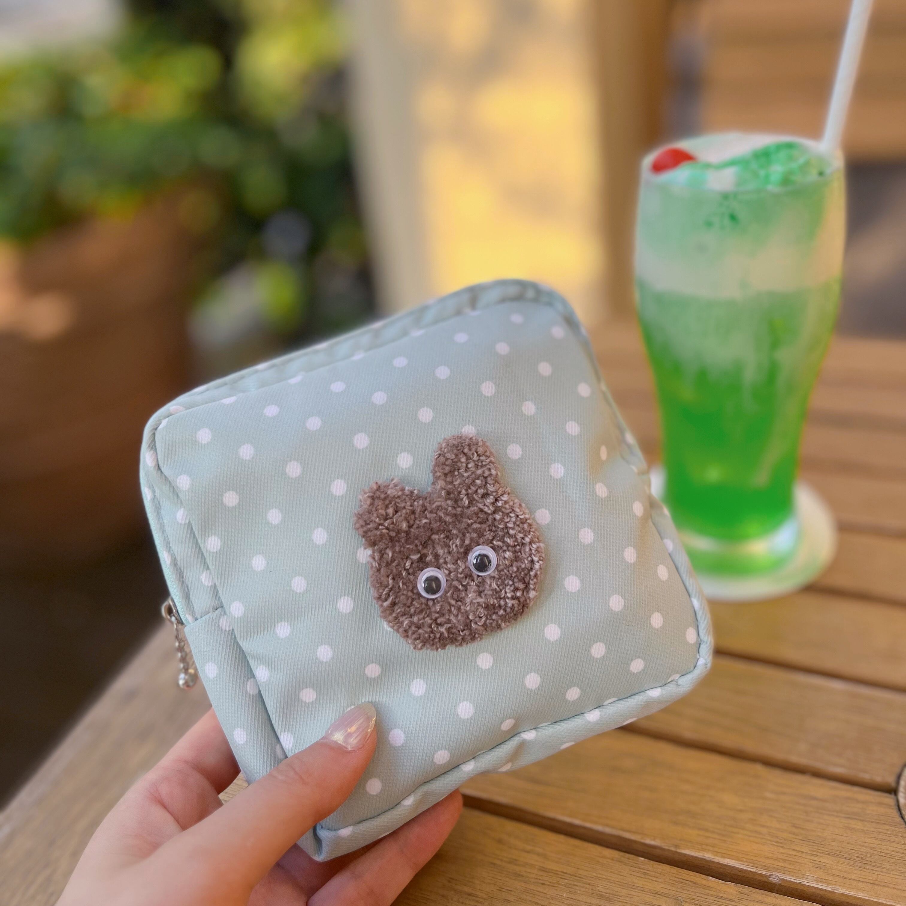 ミントグリーンのみずたま柄がさわやかな、もこもこくまさんのポーチ。