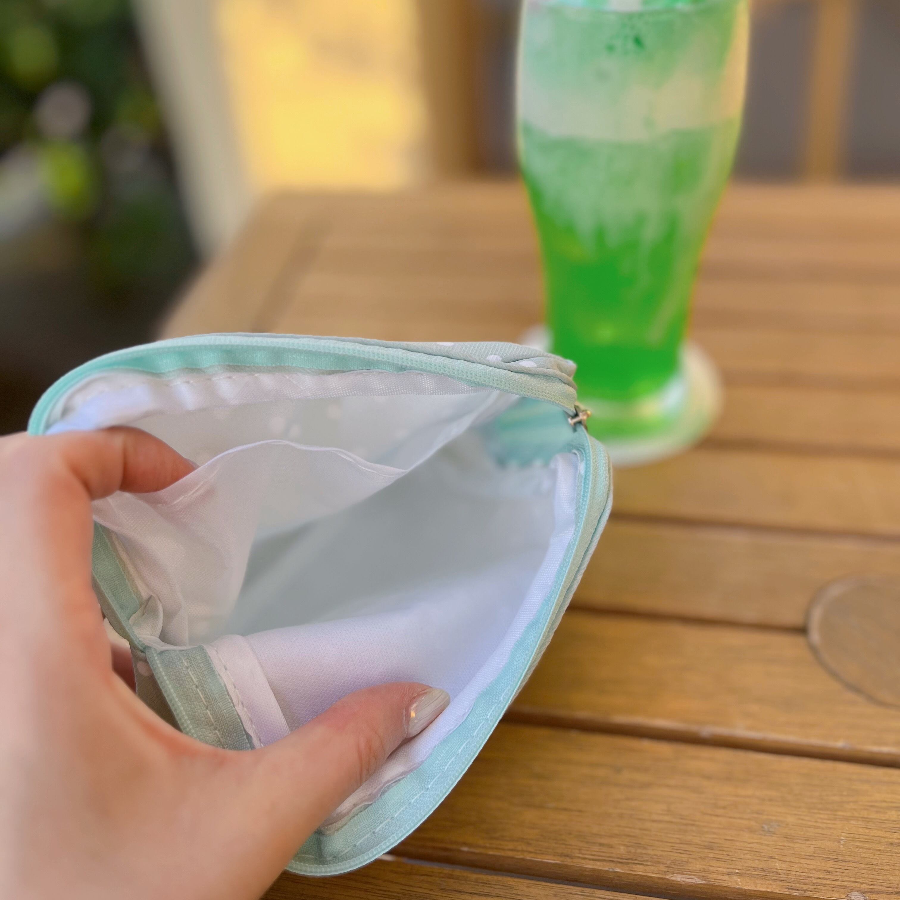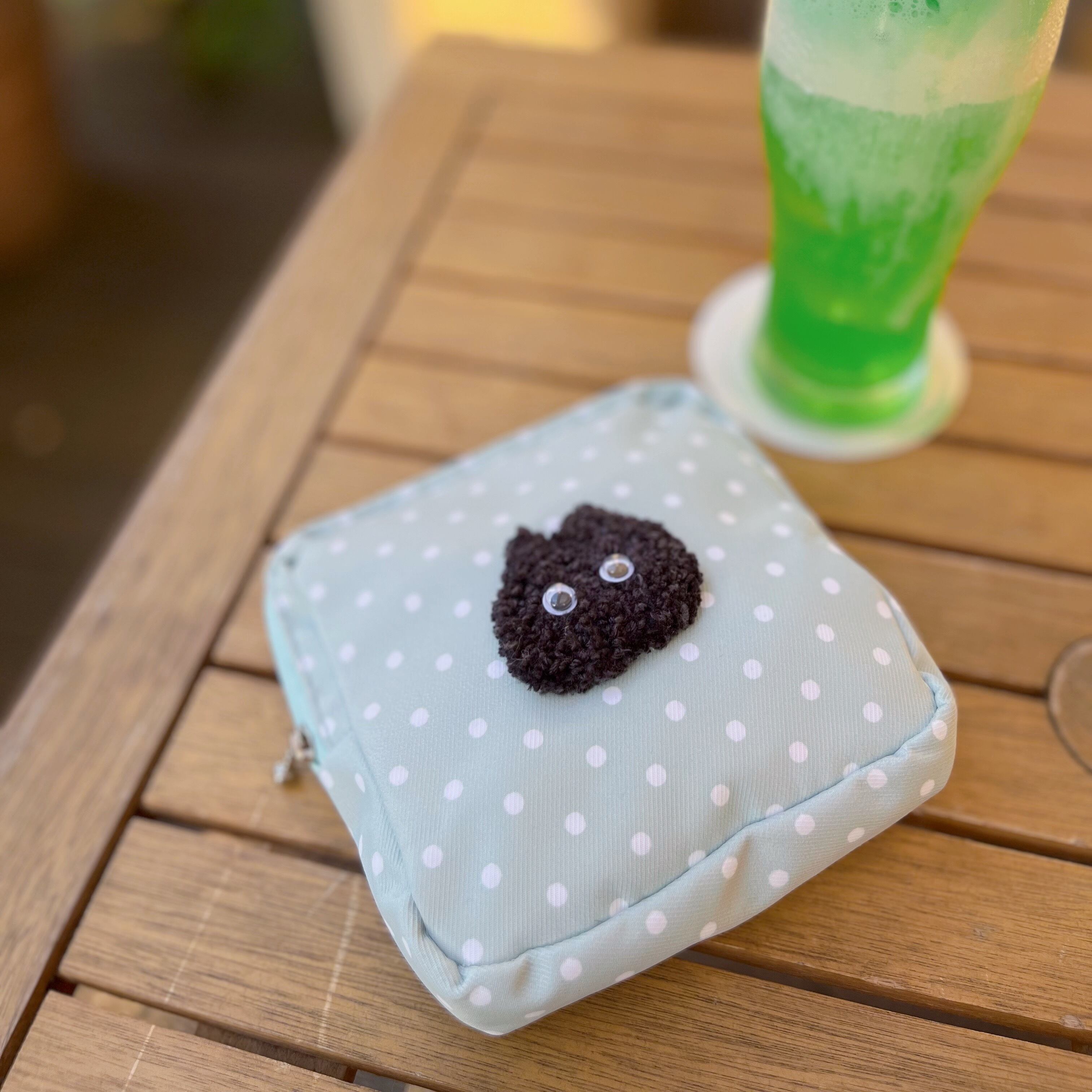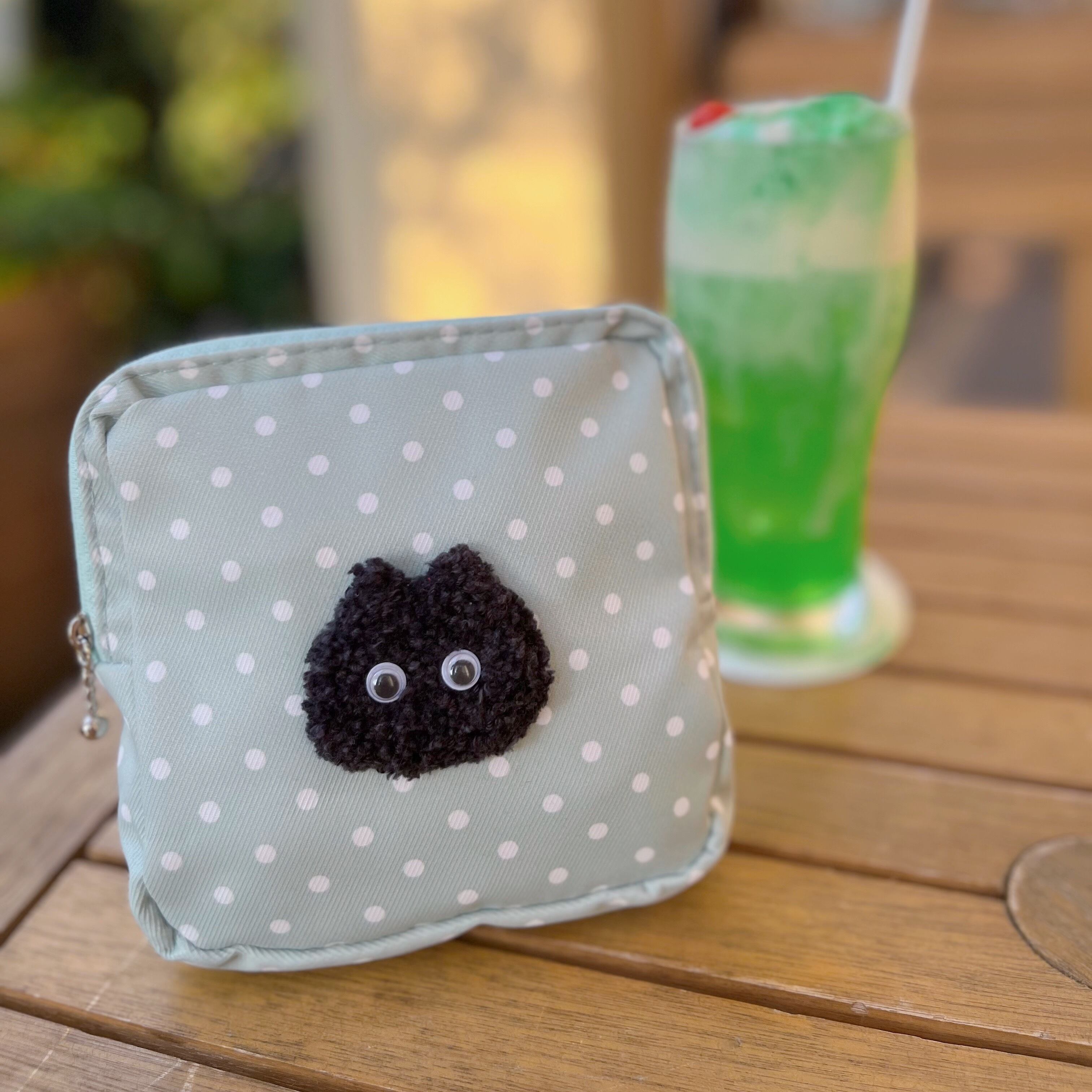 ミントグリーンのみずたま柄がさわやかな、もこもこくろねこのポーチ。