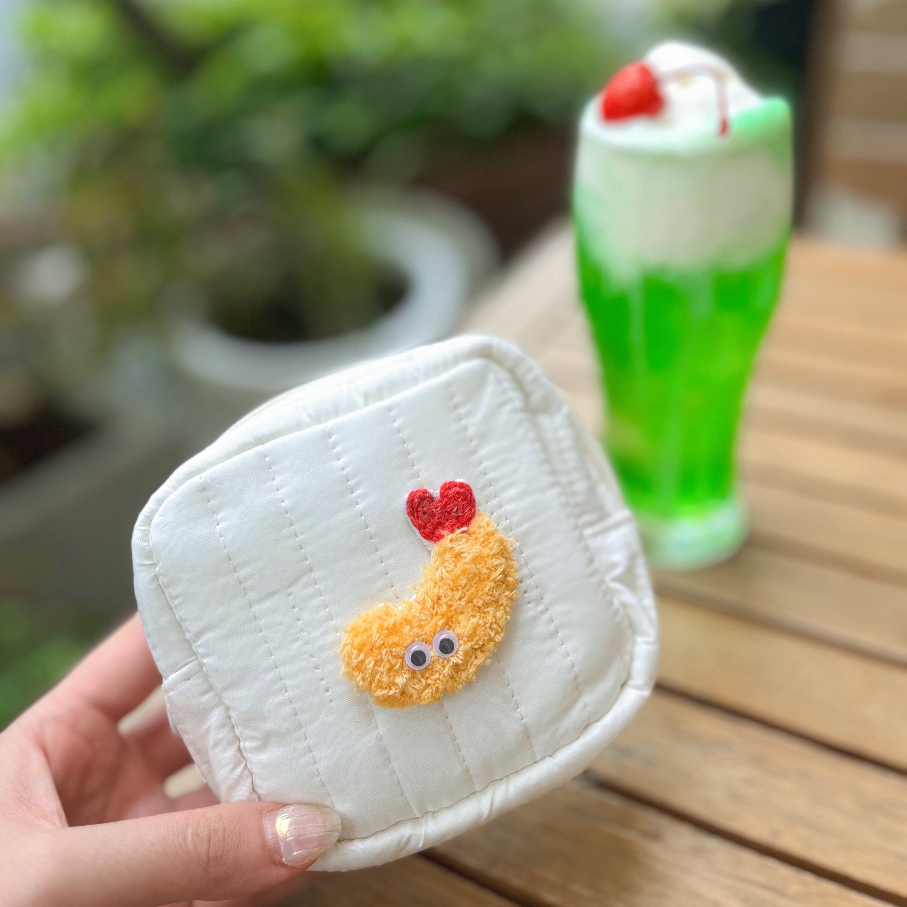 まっしろなキルティングの、もこもこえびふらいのポーチ。