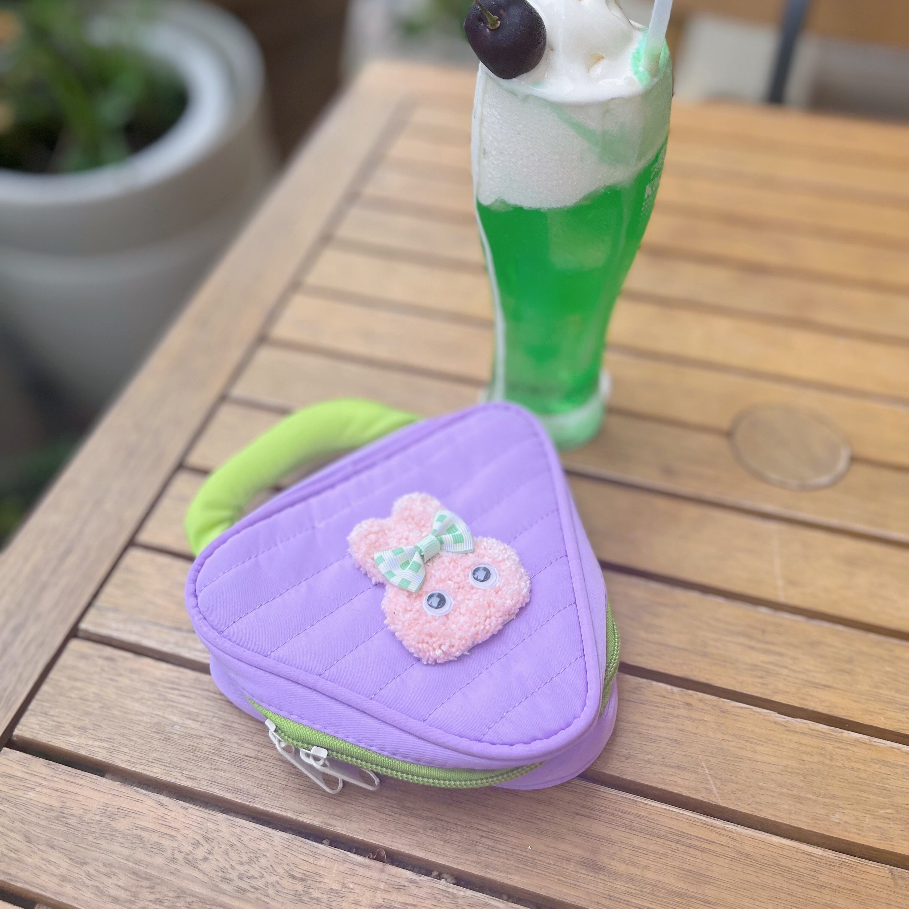三角形の形状が特徴的な、もこもこうさぎのポーチ。