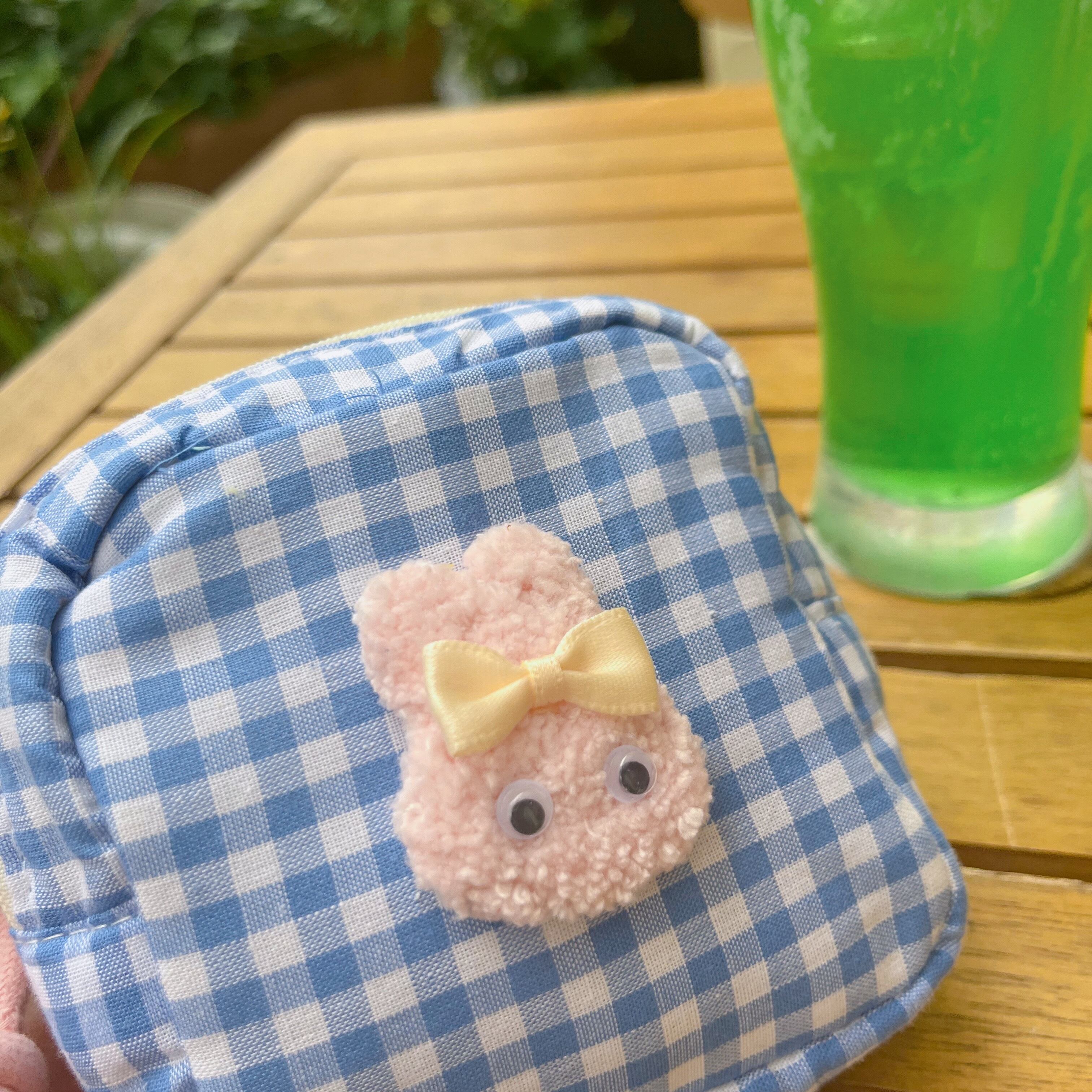 チェック柄がかわいい、もこもこうさぎのポーチ。